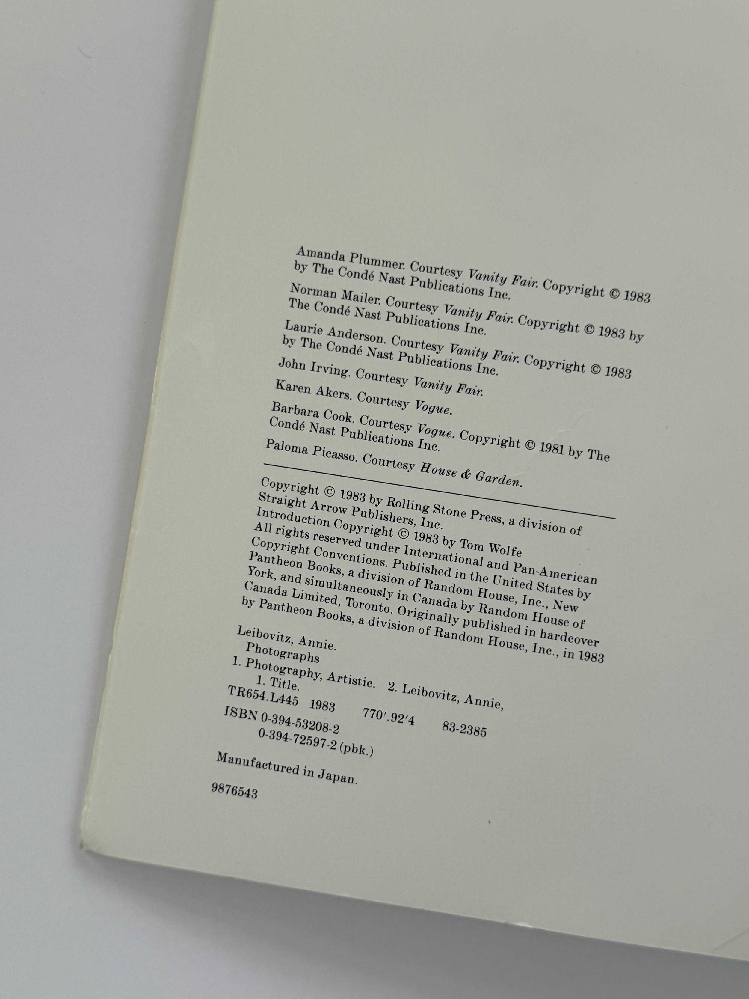 Annie Leibovitz’s first book Photographs is a collection of celebrity portraits taken in the 70s and early 80s by the world renowned photographer. Introduction by Tom Wolfe. Portraits include Mick Jagger, Lauren Hutton, Bob Dylan, Dolly Parton, Woody Allen, Sean and Yoko Ono, Rodney Dangerfield, Patti Smith, and more.